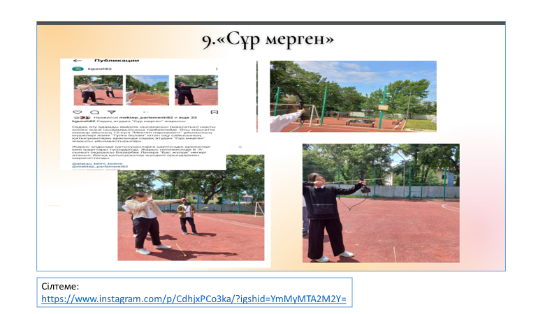 Осы мақсатта мамыр айының 12-сі күні «Мектеп парламенті» ұйымының мүшелері және «Тұлға болам» кітап оқу сайысының қатысушылары арасында садақ атудан «Сұр мерген» жарысы ұйымдастырылды.