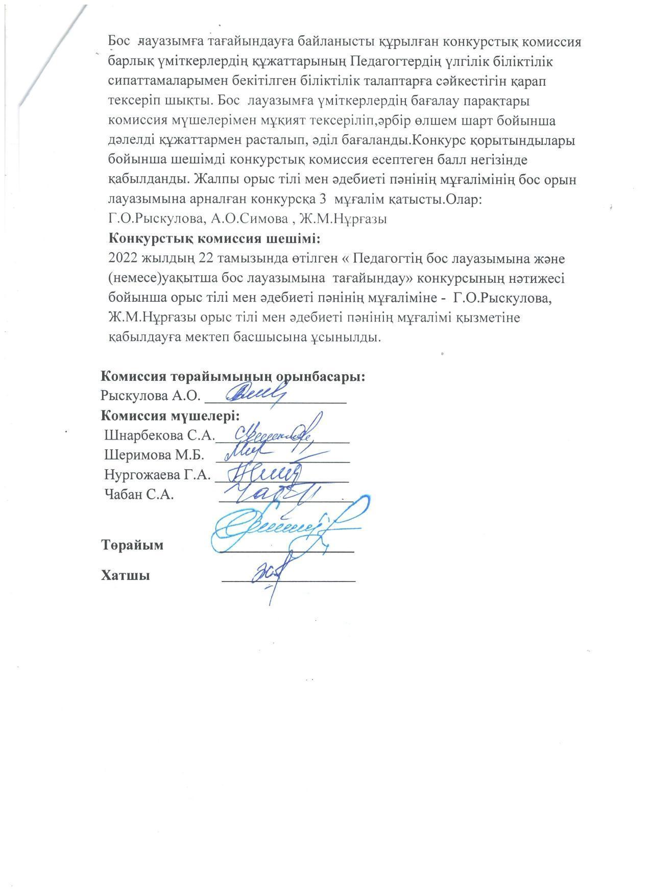 22 тамыз 2022 0 1 2 3 4 5 Білім беру ұйымдарының педагогтерін бос немесе уақытша бос лауазымдарға тағайындау туралы конкурстың хаттамасы