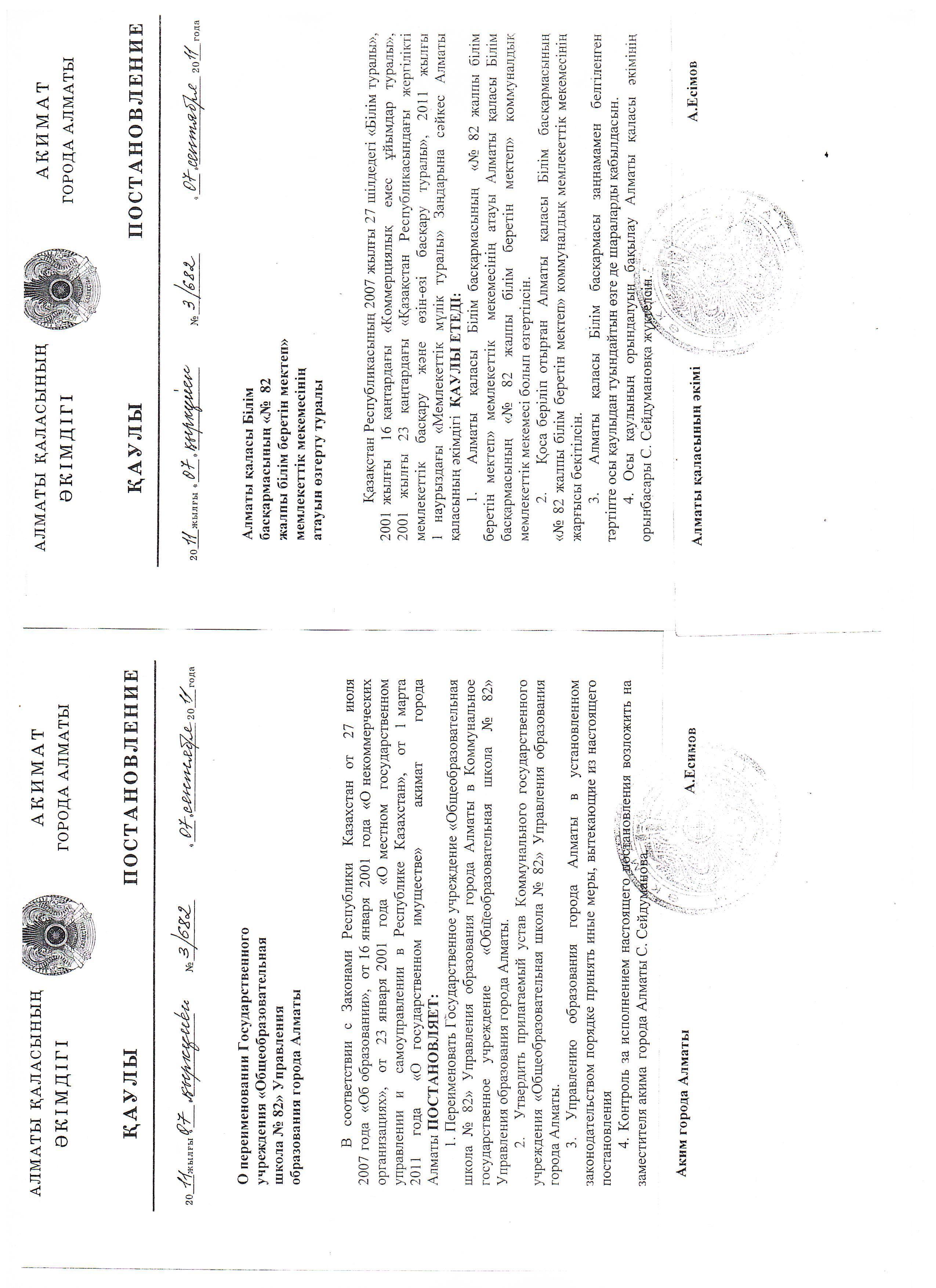 » Аттестация » Өзін-өзі бағалау » Алматы қаласы Білім басқармасының "№82 жалпы білім беретін мектеп" мемлекеттік мекемесінің атауын өзгерту туралы Алматы қаласы әкімдігінің 07 қыркүйек 2011 жылғы №3/682 қаулысы