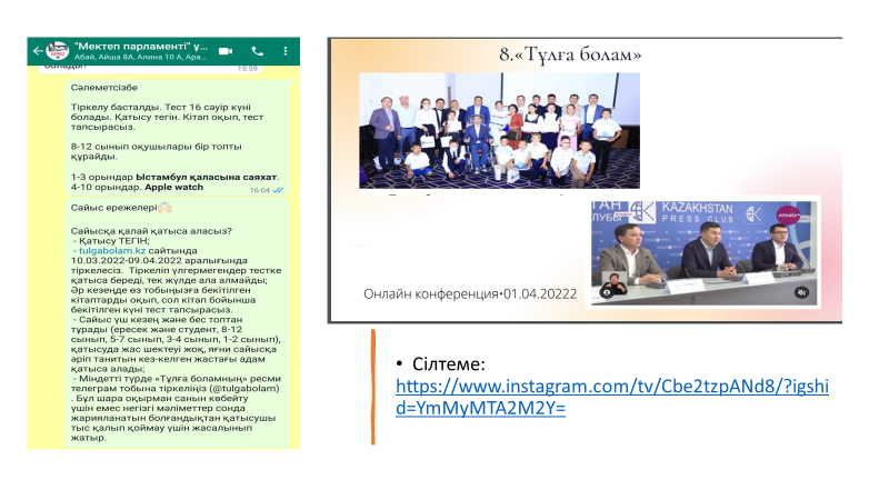 «Шұғыла» қайырымдылық қорының қолдауымен, «Дария Дамыту орталығының» ұйымдастыруымен, «Тұлға болам» республикалық кітап оқу жарысы тұрақты түрде өтіп отырады. Онлайн конференция барысында оқушыларға «Тұлға болам» атты жарыс өткендігі, алдағы уақытта жалғасын табатындығы туралы мәліметтер берілді. Жиналыс соңында МП ақпарат фракция басшысына жарыс туралы мәліметтерді әлеуметтік желі арқылы таратуға тапсырма берілді. Тапсырмалар өз уақытылы орындалды. Әлеуметтік желі арқылы 258 адам мәліметтермен танысты.