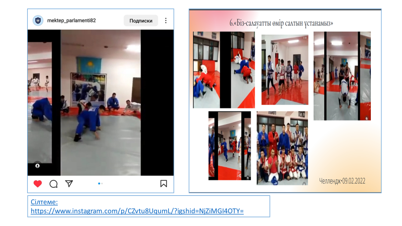 «Біз салауатты өмір салтын ұстанамыз» қашықтықтан өткізілетін челленджі арқылы Алматы қаласы, Алатау ауданы бойынша білім беру ұйымдарындағы «Мектеп Парламент» білім алушылардың өзін-өзі басқару органдарын дамыту тұжырымдамасын іске асыру негізінде өскелең ұрпақты салауатты өмір салтын ұстануға тәрбиелеу. Шығармашылық тұрғыдан өзін-өзі танытуы мақсатында өткізілді.