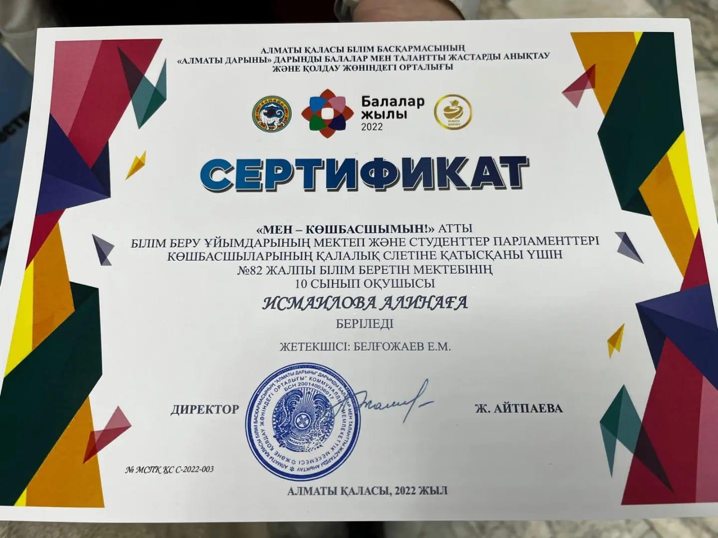 "Мен - көшбасшымын" атты білім беру ұйымдарының мектеп және студенттер парламенттері көшбасшыларының қалалық слетына 11 сынып оқушысы Исмаилова Алина қатысып, сертификат иегері атанды.