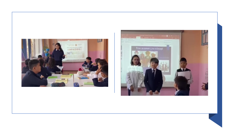 Мектебіміздің "Жас Ұлан" жастар мен жасөспірімдер ұйымын көш бастаған Ұланбасы Оспангалиева Анель, Юсупходжаева Амина мен Базарбек Лунара жылдық жоспарға сәйкес 6”ә”сынып оқушыларына "Ұлы даланың ұлы есімдері" атты дөңгелек үстел өткізді.