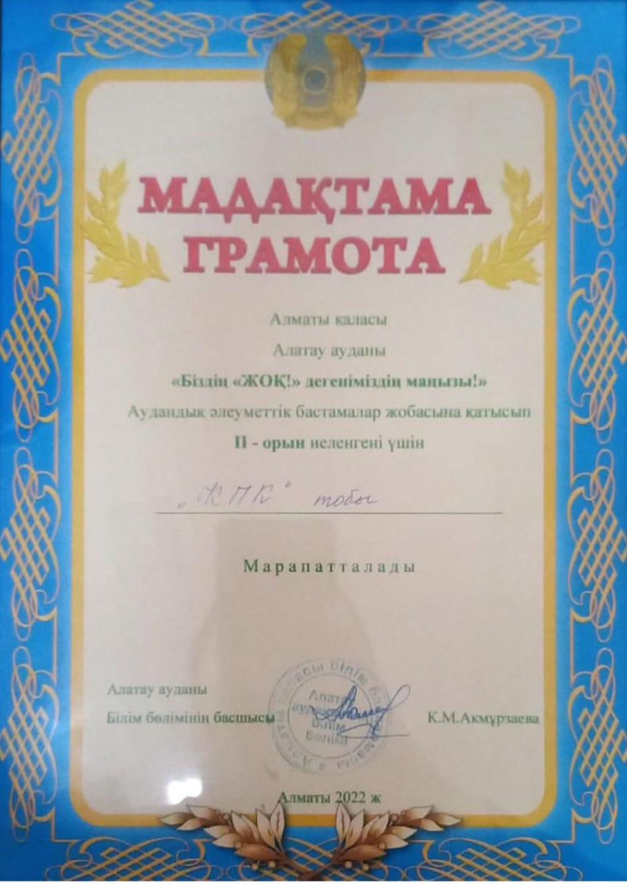 28 қараша 2022 0 1 2 3 4 5 Біздің “ЖОҚ!” дегеніміздің маңызы! Алатау ауданы, №26 ЖББМ-те өткен “Біздің “ЖОҚ!” дегеніміздің маңызы!” атты қалалық әлеуметтік бастамалар жобасының аудандық кезеңінде II орын иеленгені үшін “КПК” тобы марапатталады.Жетекшісі: ДТІЖО Л.Б.Камзина