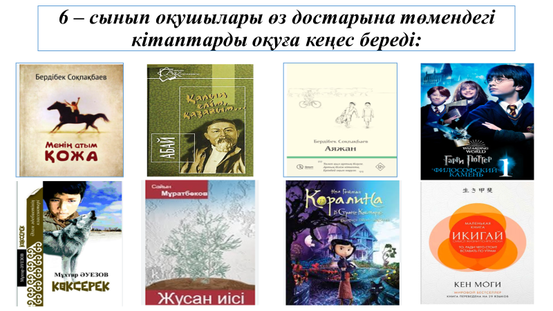 07 ақпан 2023 0 1 2 3 4 5 Сауалнама нәтижесі "Оқуға құштар мектеп" жобасы аясында 6-сынып оқушыларынан сауалнама алынды. Оқушылар достарына ұсынған кітаптарды сізде оқып, білім көкжиегіңізді кеңейтіңіз.