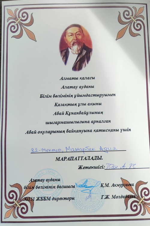 24 ақпан 2023 0 1 2 3 4 5 Абай оқулары Алматы қаласы, Алатау ауданы, Білім бөлімінің ұйымдастыруымен Қазақтың ұлы ақыны Абай Құнанбайұлының шығармашылығына арналған Абай оқуларының байқауына қатысқаны үшін Манарбек Адия марапатталады. Жетекшісі: Айдана Жанарханқызы