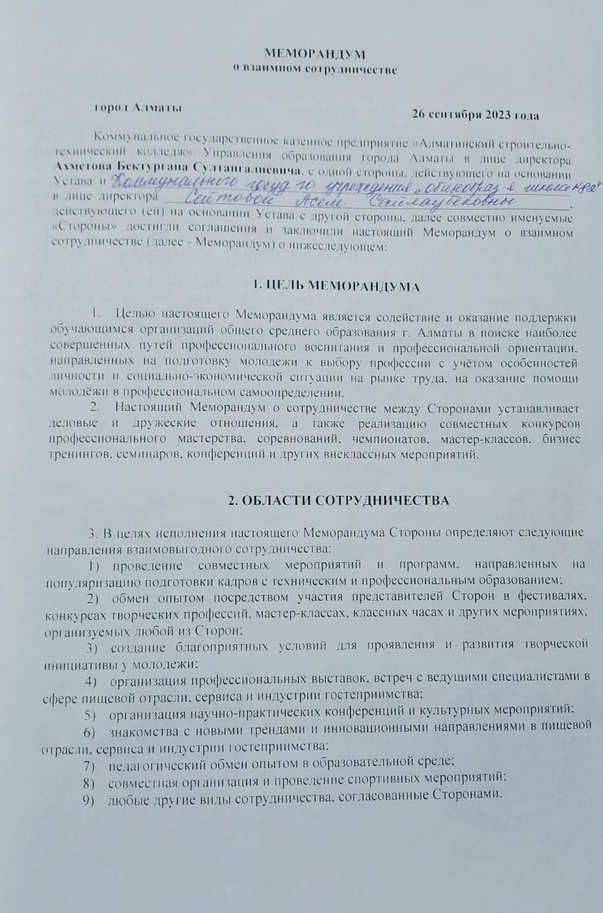 МЕМОРАНДУМ о взаимном сотрудничестве с "Алматинской строительно-техническим колледжем"