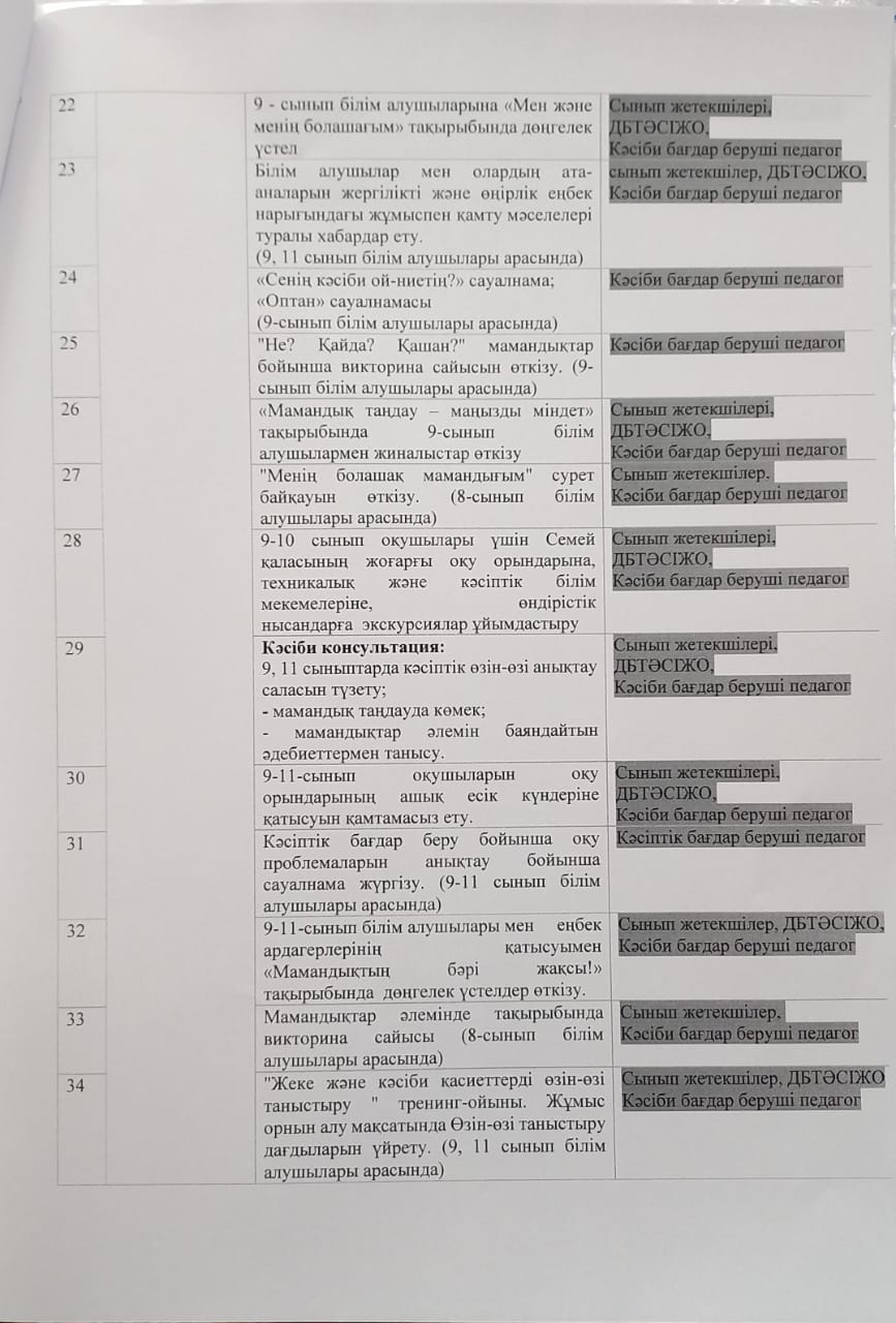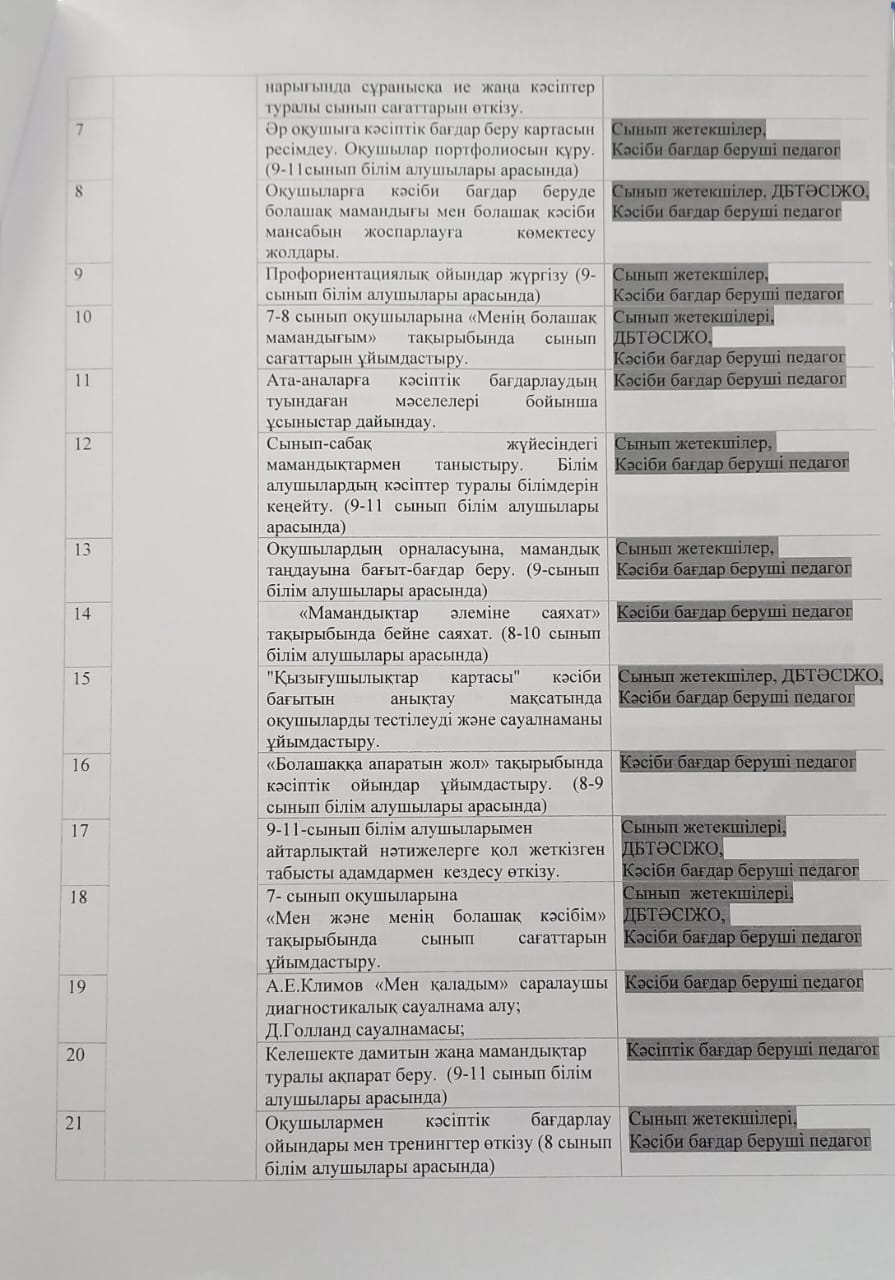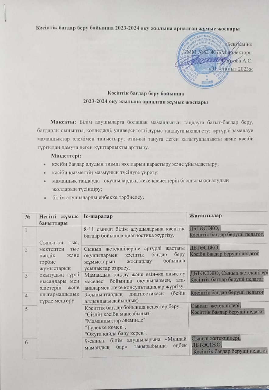 01 қыркүйек 2023 0 1 2 3 4 5 Кәсіптік бағдар бойынша 2023-2024 оқу жылына арналған жұмыс жоспары Кәсіптік бағдар бойынша 2023-2024 оқу жылына арналған жұмыс жоспары