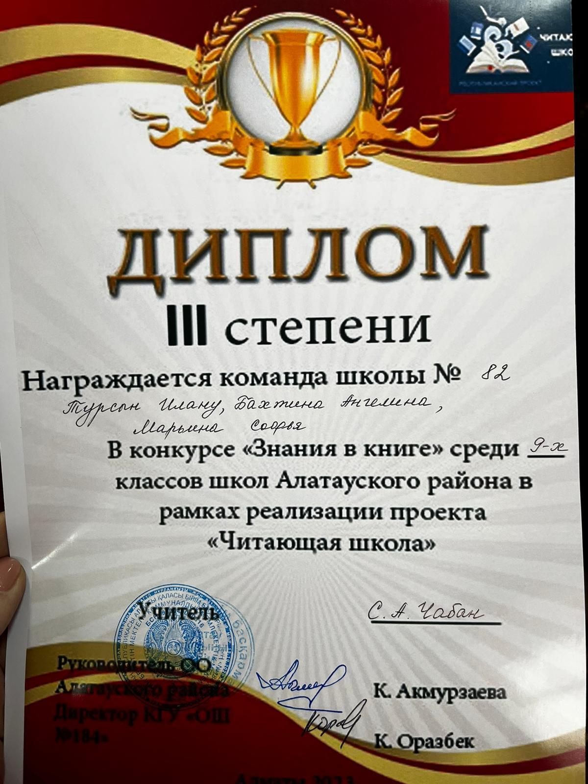 В конкурсе “Знания в книге” среди 9-х классов школ Алатауского района в рамках реализации проекта “Читающая школа”