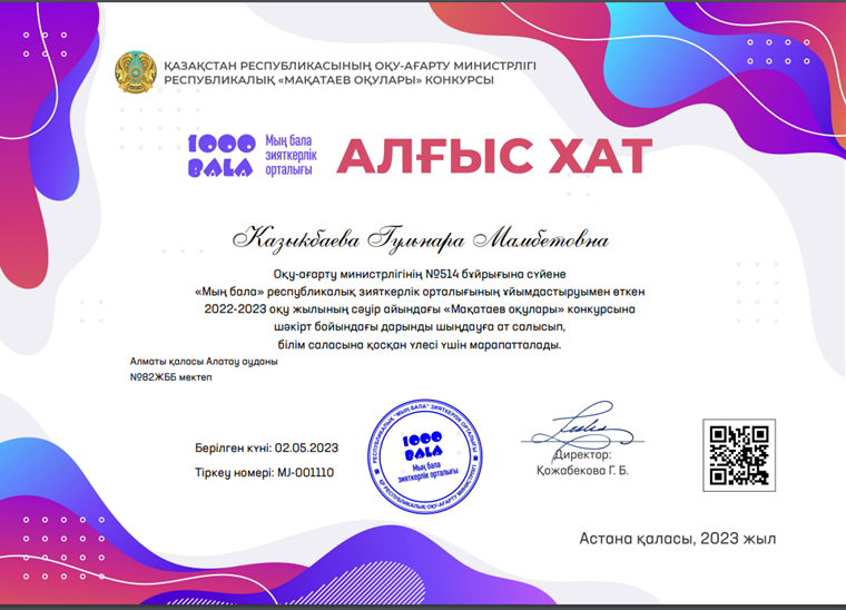 Оқу-ағарту министрлігінің №514 бұйрығына сүйене "Мың бала" республикалық зияткерлік орталығының ұйымдастыруымен өткен 2022-2023 оқу жылының Сәуір айындағы "Мақатаев оқулары" конкурсына шәкірт бойындағы дарынды шыңдауға ат салысып, білім саласына қосқан үлесі үшін мектебіміздің қазақ тілі мен әдебиеті пәнінің мұғалімі Қазықбаева Гульнара Мамбетовна алғыс хатпен марапатталды.