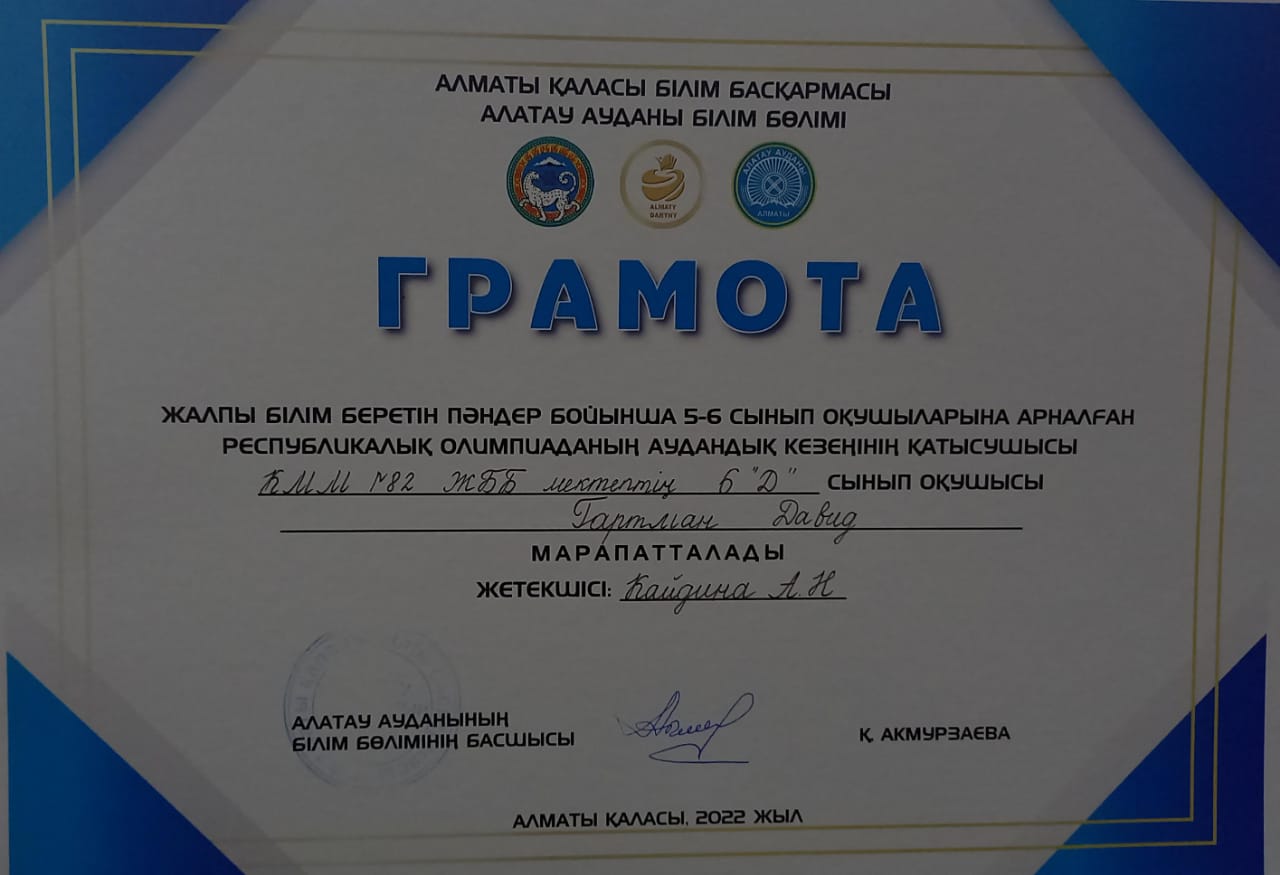 17 қараша 2023 0 1 2 3 4 5 5-6 сынып оқушыларына арналған республикалық олимпиада №82 ЖББМ 6"Б" сынып оқушысы Гартман Давид. Жетекшісі:Кайдина А.Н.