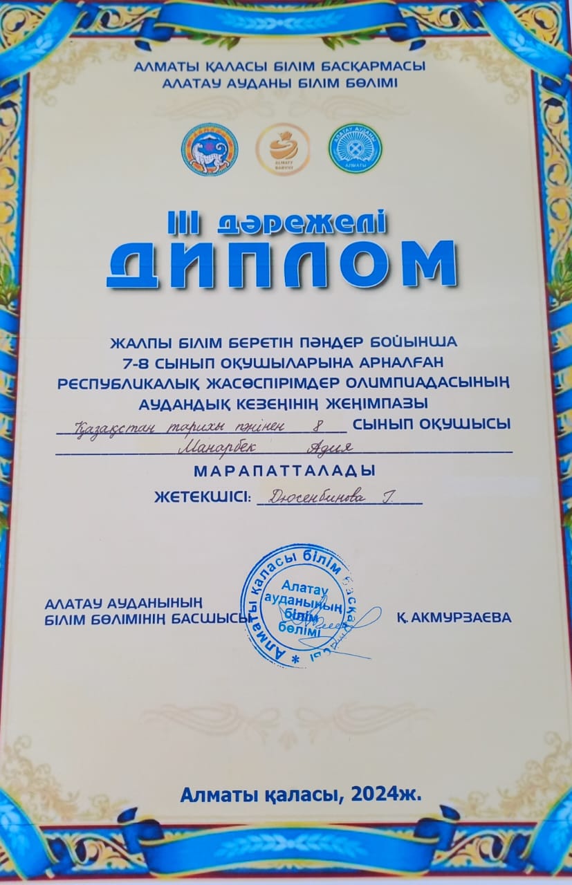 » Біз туралы » Жетістіктеріміз » 7-8 сынып оқушыларына арналған Республикалық жасөспірімдер олимпиадасының аудандық кезеңінің 3 дәрежелі жеңімпазы Қазахстан тарихы пәнінен 8 "А"сынып оқушысы Манарбек Адия марапатталды. Жетекшісі: Дюсенбинова Г.