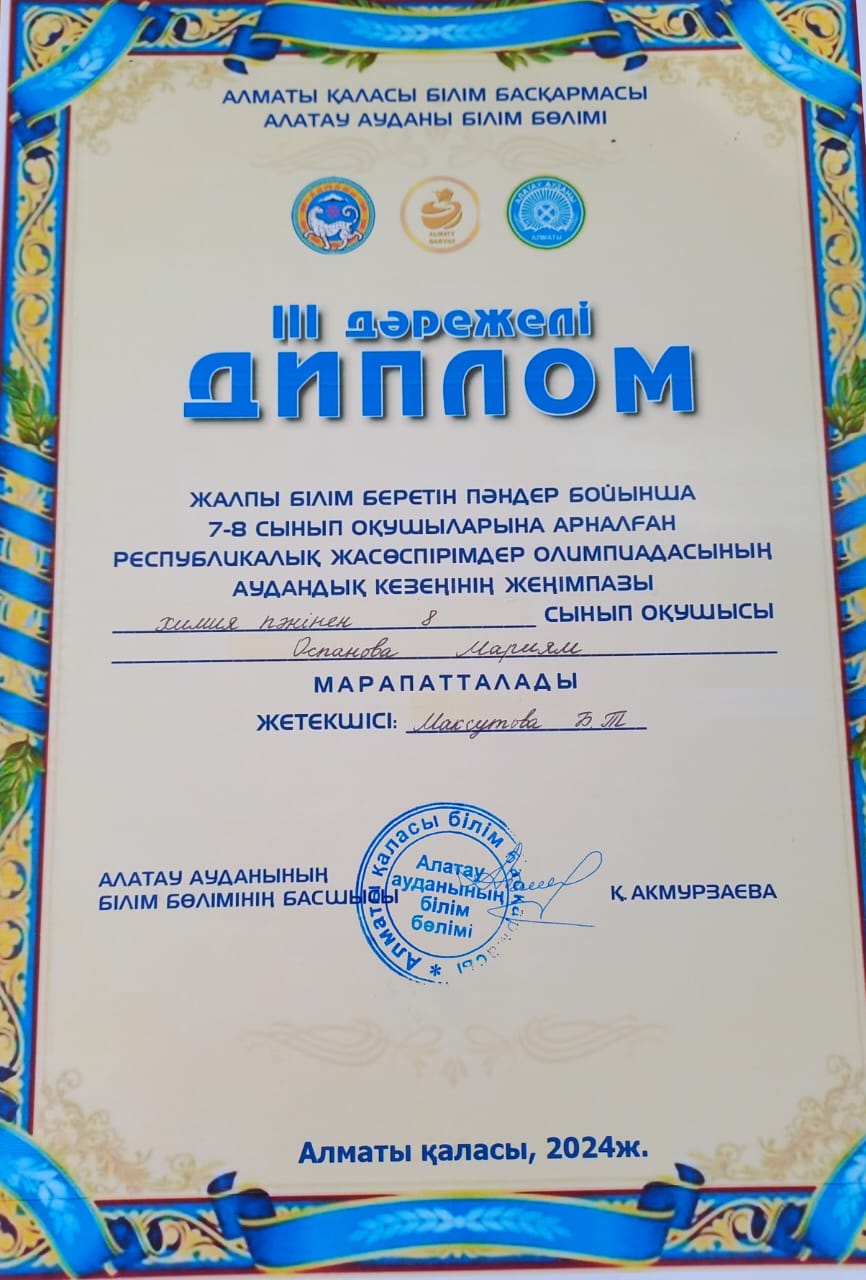 7-8 сынып оқушыларына арналған Республикалық жасөспірімдер олимпиадасының аудандық кезеңінің 3 дәрежелі жеңімпазы химия пәнінен 8 сынып оқушысы Оспанова Мариям марапатталады. Жетекшісі: Максутова Б.Т.