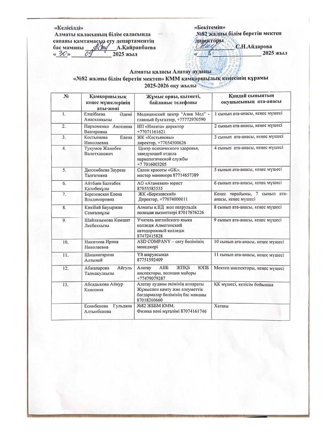 Қамқоршылық кеңесінің құрамы. Состав попечительского совета школы