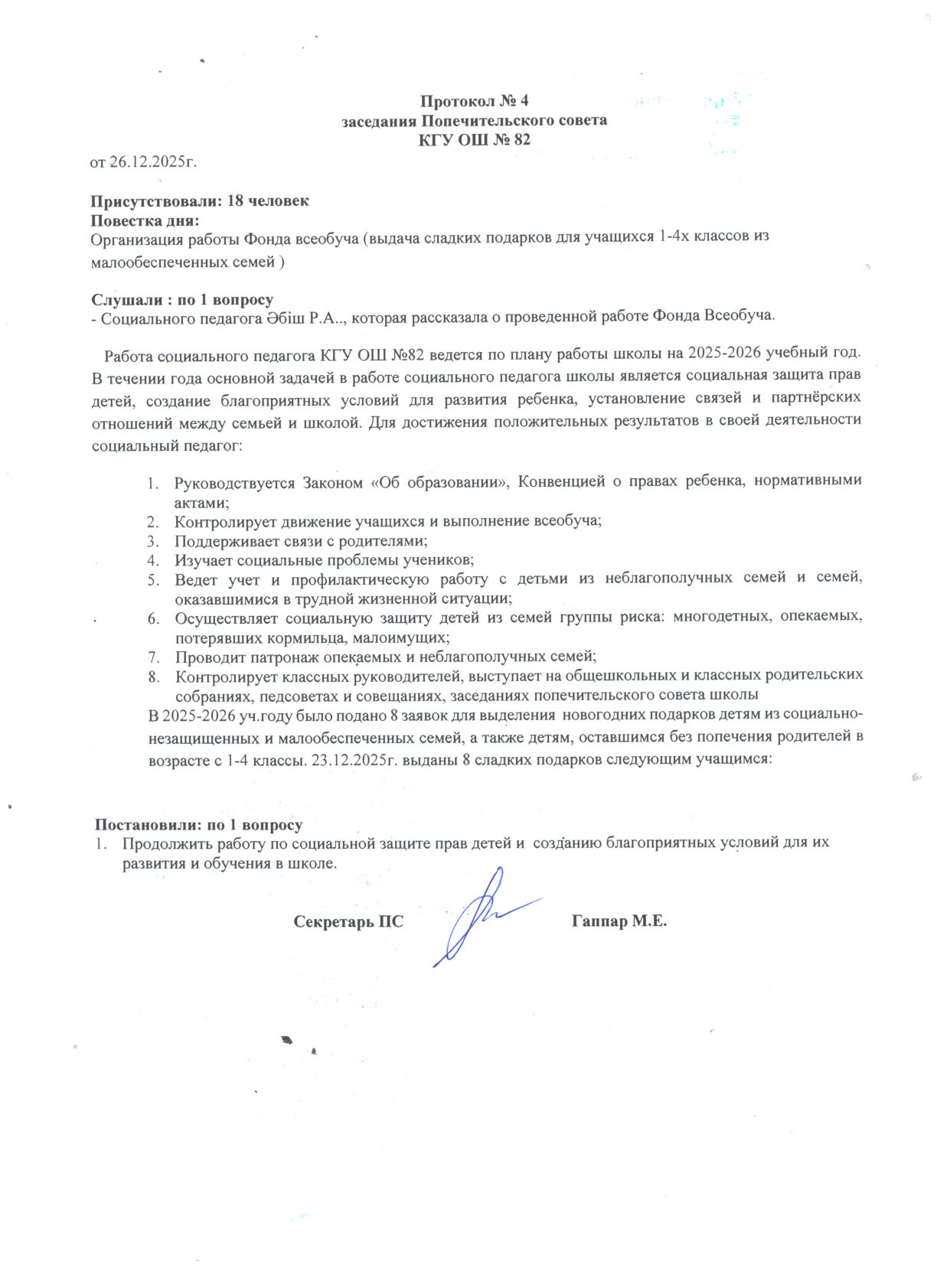 Қамқоршылық кеңесінің № 4 хаттамасы