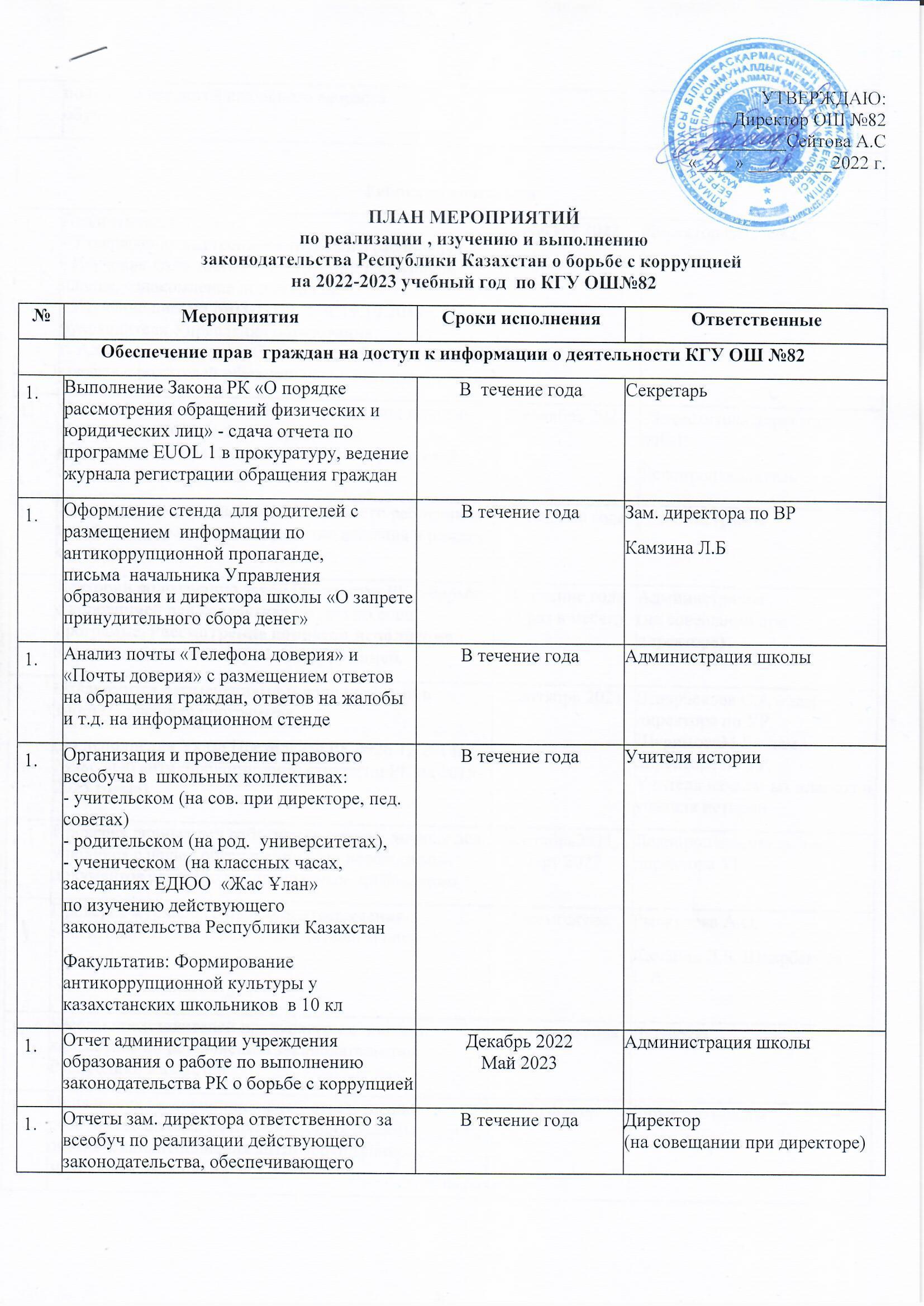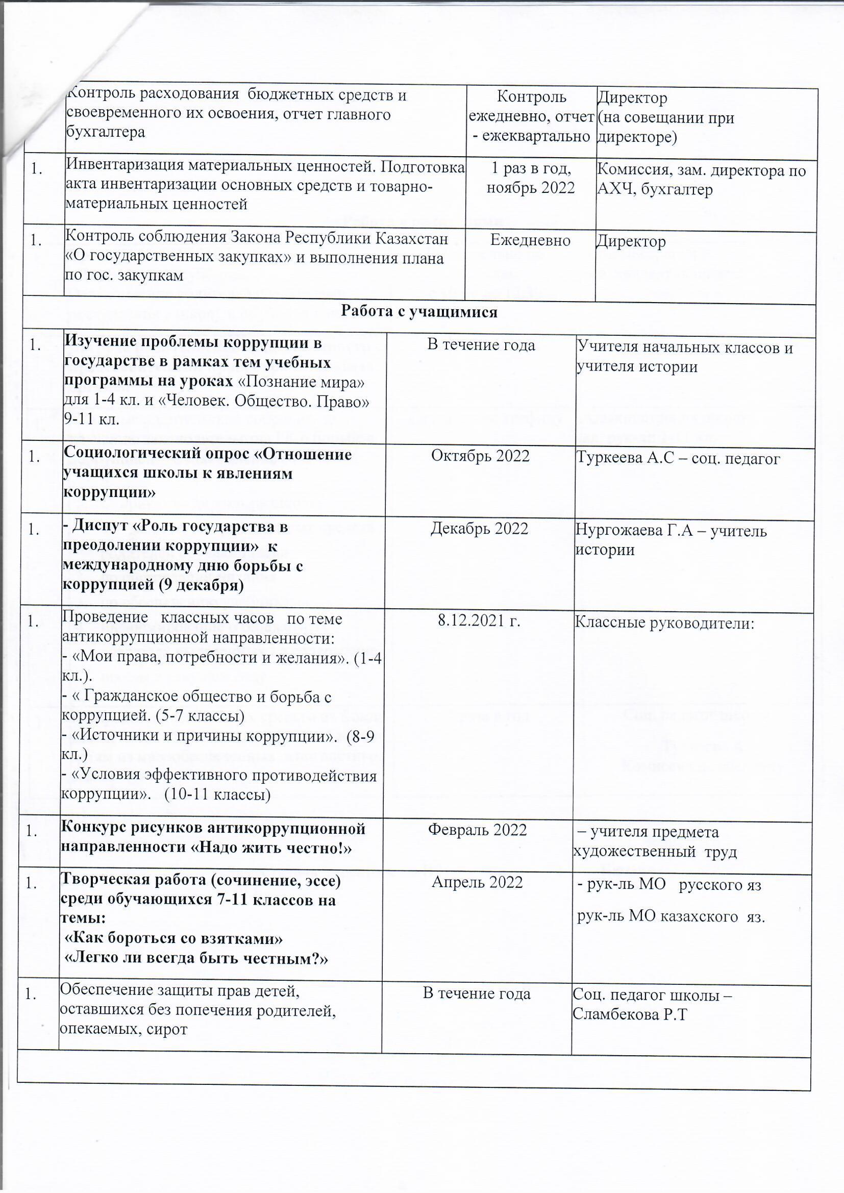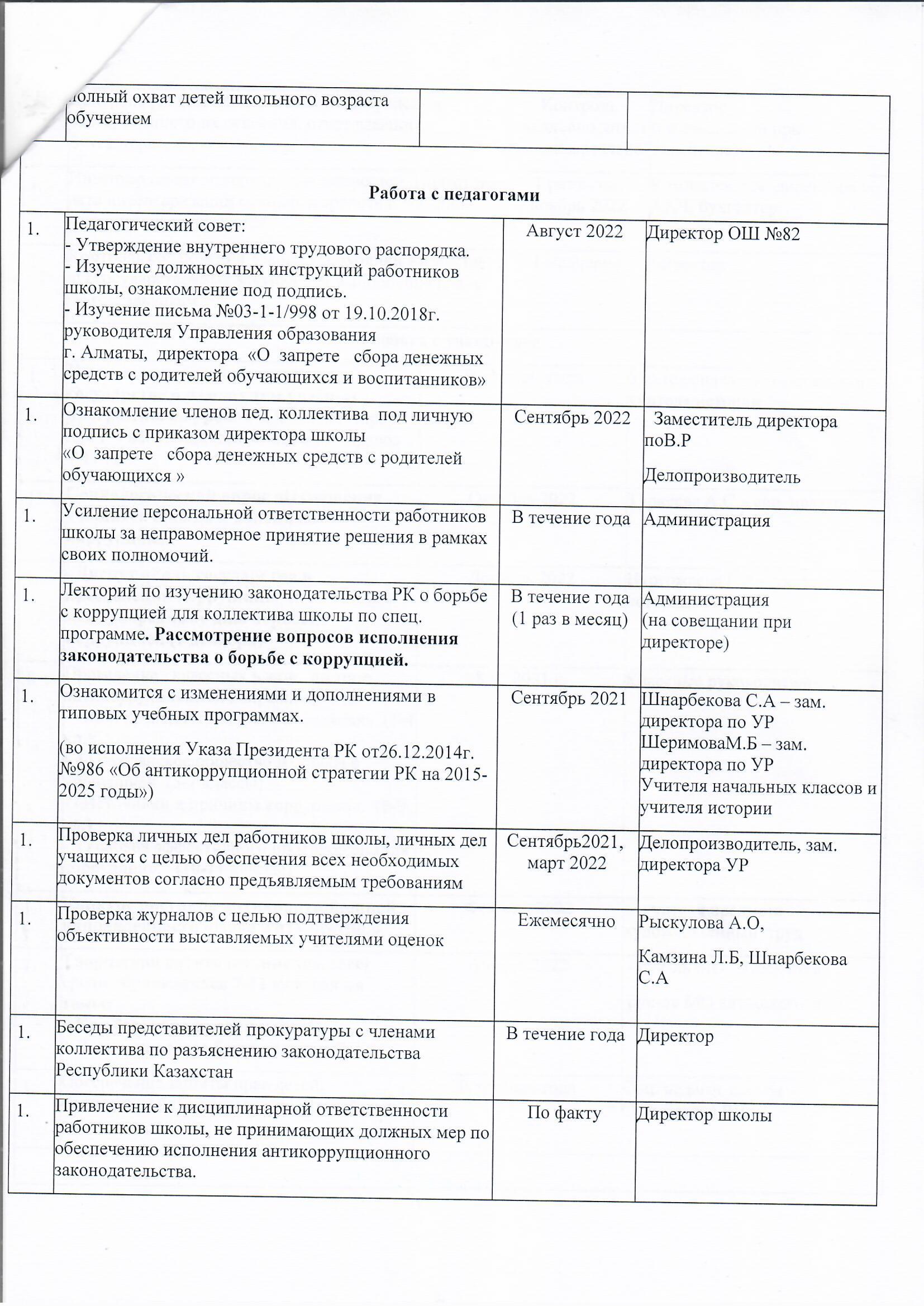 2021-2022 оқу жылына арналған "Sanaly urpaq" жобасы аясында №82 ЖББМ сыбайлас жемқорлыққа қарсы кешенді жұмыс жоспары