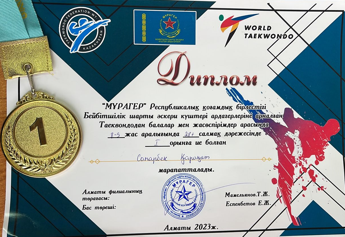 16 ақпан 2023 0 1 2 3 4 5 "Мұрагер" Республикалық қоғамдық бірлестігі "Мұрагер" Республикалық қоғамдық бірлестігіБейбітшілік шарты әскери күштері ардагерлеріне арналған Таэквондадан балалар мен жасөспірімдер арасында өткен жарыста жүлделі І орынға ие болған Сапарбек Қарақат марапатталады.