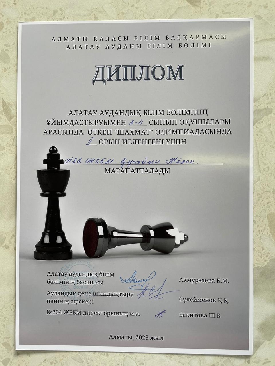 03 наурыз 2023 0 1 2 3 4 5 Құсайын Тілек - "Шахмат" олимпиадасының жүлдегері Алатау аудандық білім бөлімінің ұйымдастыруымен 2-4 сынып оқушылары арасында өткен "Шахмат" олимпиадасында ІІ орын иеленгені үшін Құсайын Тілек марапатталады.