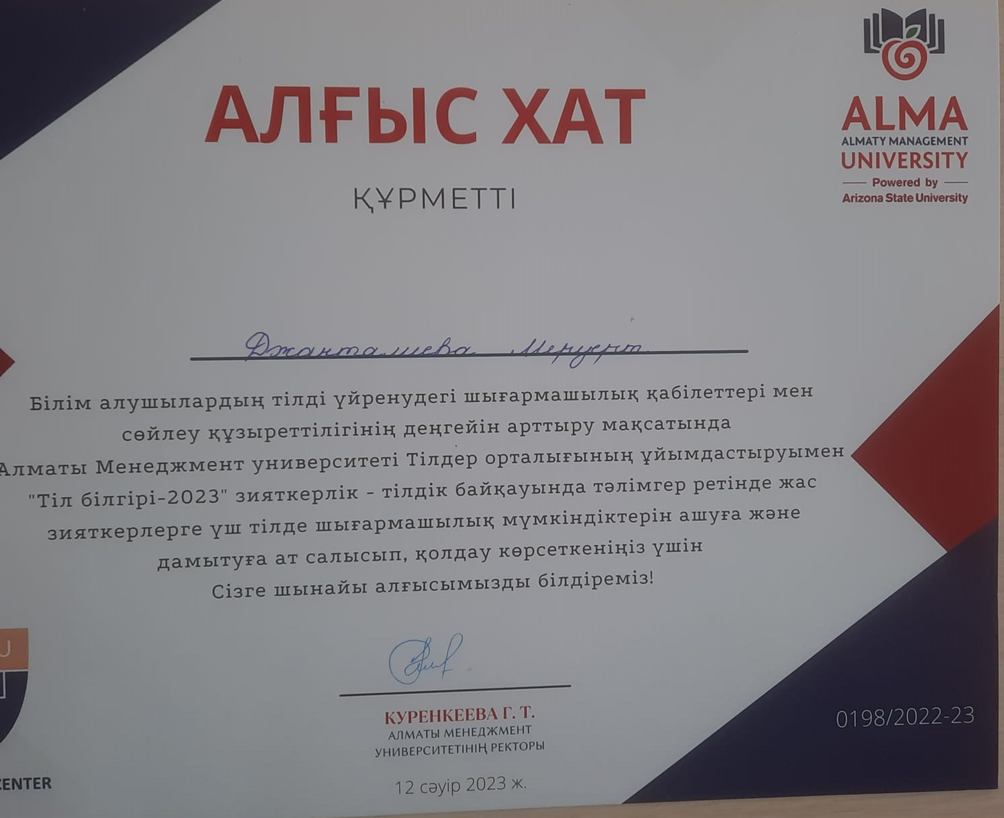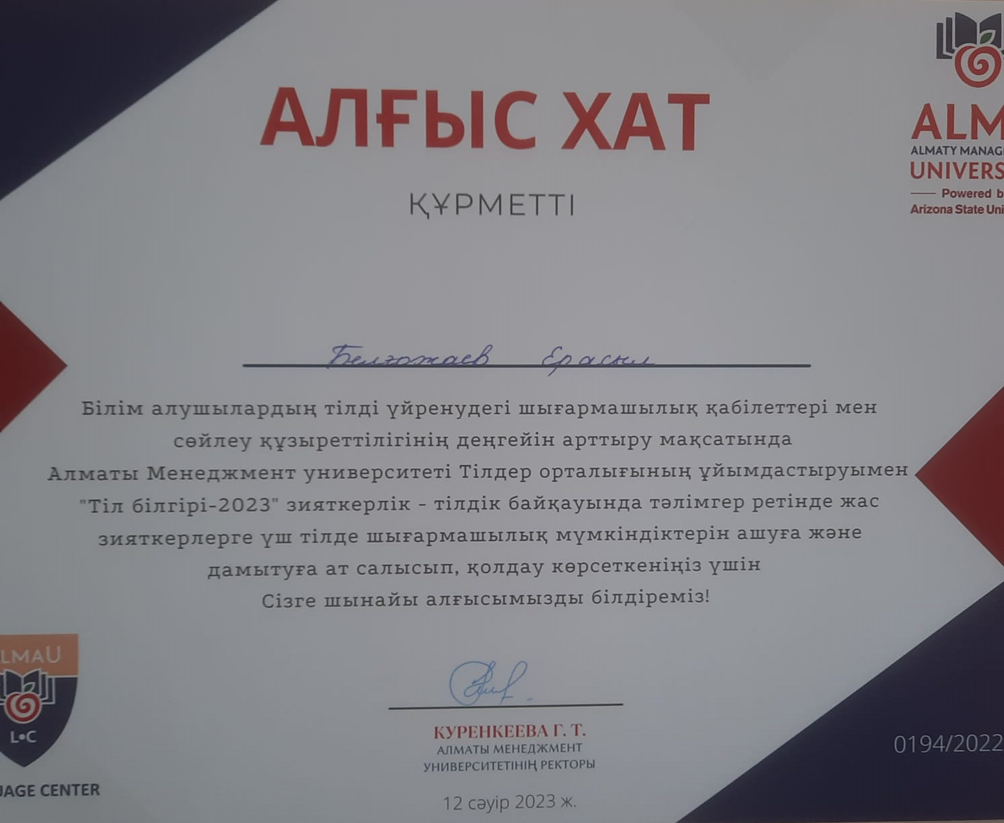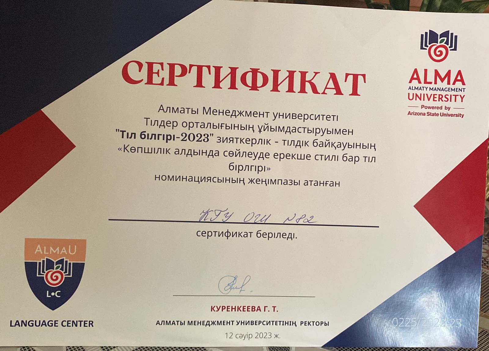 Алматы Менеджмент университеті Тілдер орталығының ұйымдастыруымен өткен "Тіл білгірі - 2023" зияткерлік - тілдік байқауына мектебіміздің 11 сынып оқушылары: Белялова Бахытгуль, Рсназарова Жулдыз және Шабаз Мадияр қатысты. Байқау нәтижесі бойынша "LANGKEYS" тобы "Ең белсенді байқау қатысушылары", "Көпшілік алдында сөйлеуде ерекше стилі бар тіл білгірі" номинацияларымен марапатталды.