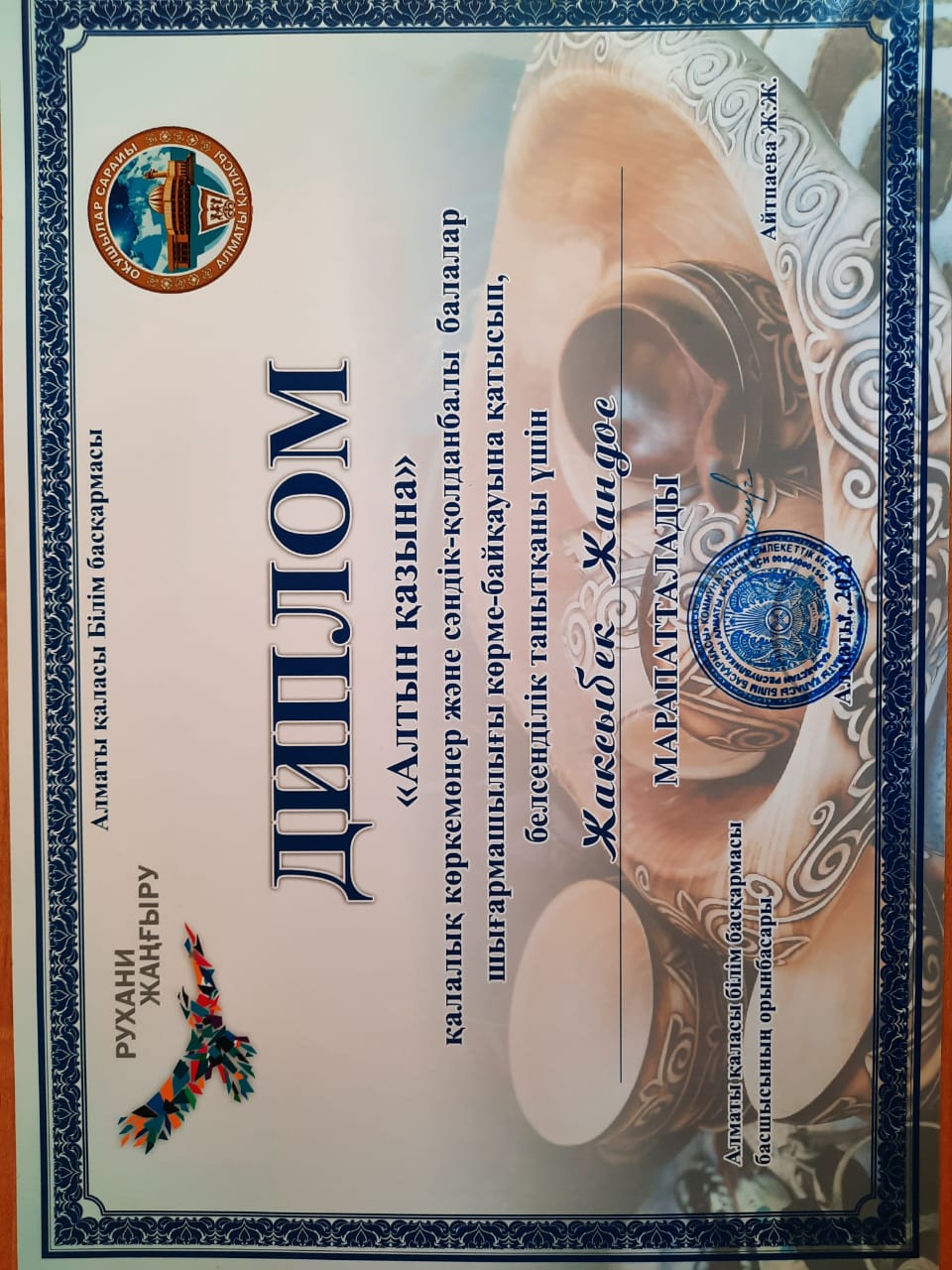 14 сәуір 2023 0 1 2 3 4 5 "Алтын қазына" "Алтын қазына" қалалық көркемөнер және сәндік-қолданбалы балалар шығармашылығы көрме-байқауына қатысып, белсенділік танытқаны үшін Жақсыбай Жандос марапатталады.