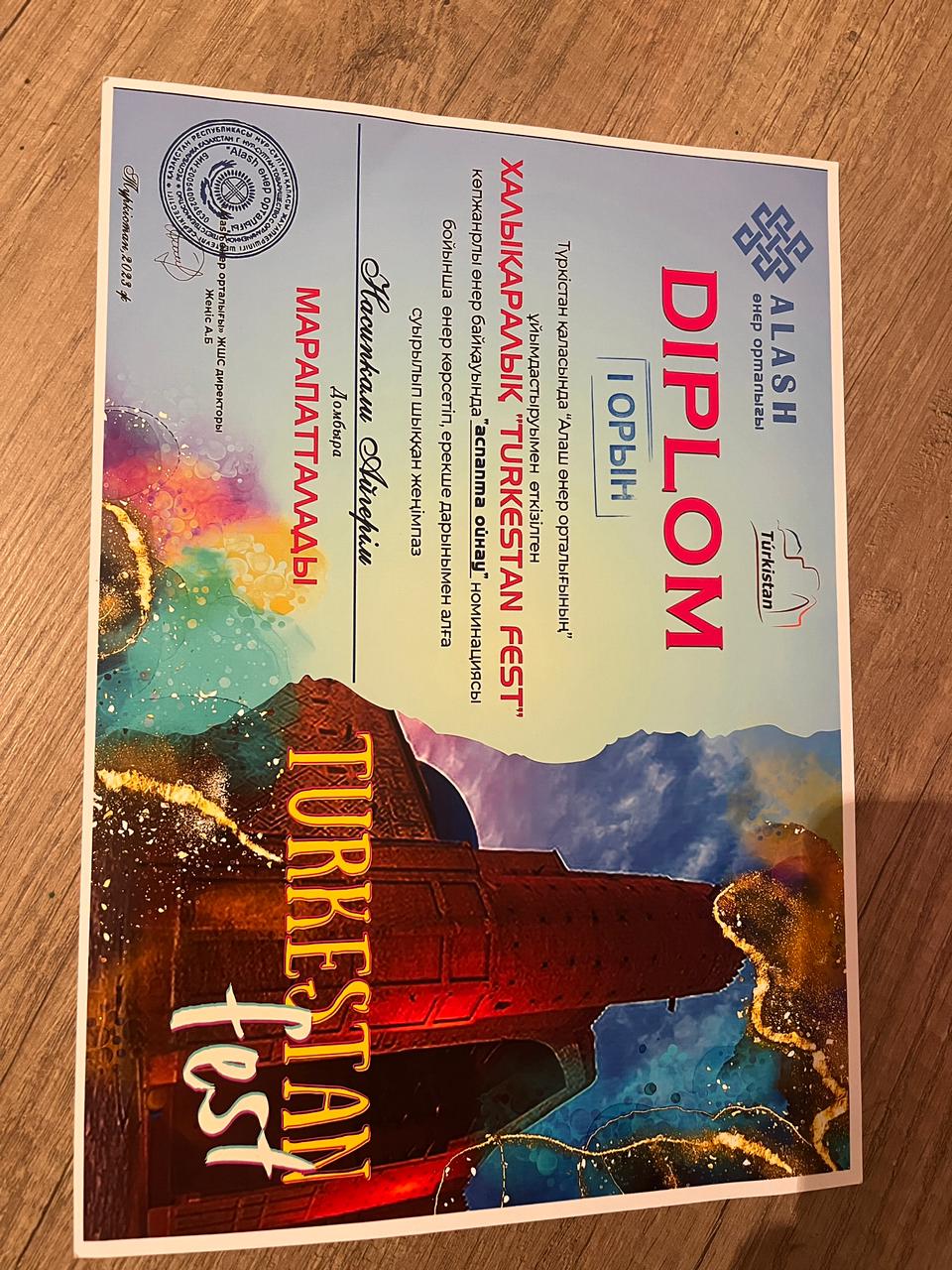 "Алаш өнер орталығының" ұйымдастыруымен өткізілген ХАЛЫҚАРАЛЫҚ "TURKESTAN FEST" көпжанрлы өнер байқауында "аспапта ойнау" номинациясы бойынша өнер көрсетіп, ерекше дарынымен көзге түсіп, "Бас жүлде" иегері атанды.