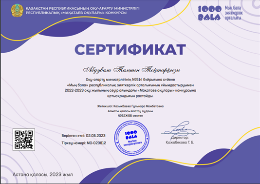Оқу-ағарту министрлігінің №514 бұйрығына сүйене "Мың бала" республикалық зияткерлік орталығының ұйымдастыруымен өткен 2022-2023 оқу жылының Сәуір айындағы "Мақатаев оқулары" конкурсына қатысып, І орын иеленгені үшін Абдували Талшын Тоқтарқызы марапатталады.
