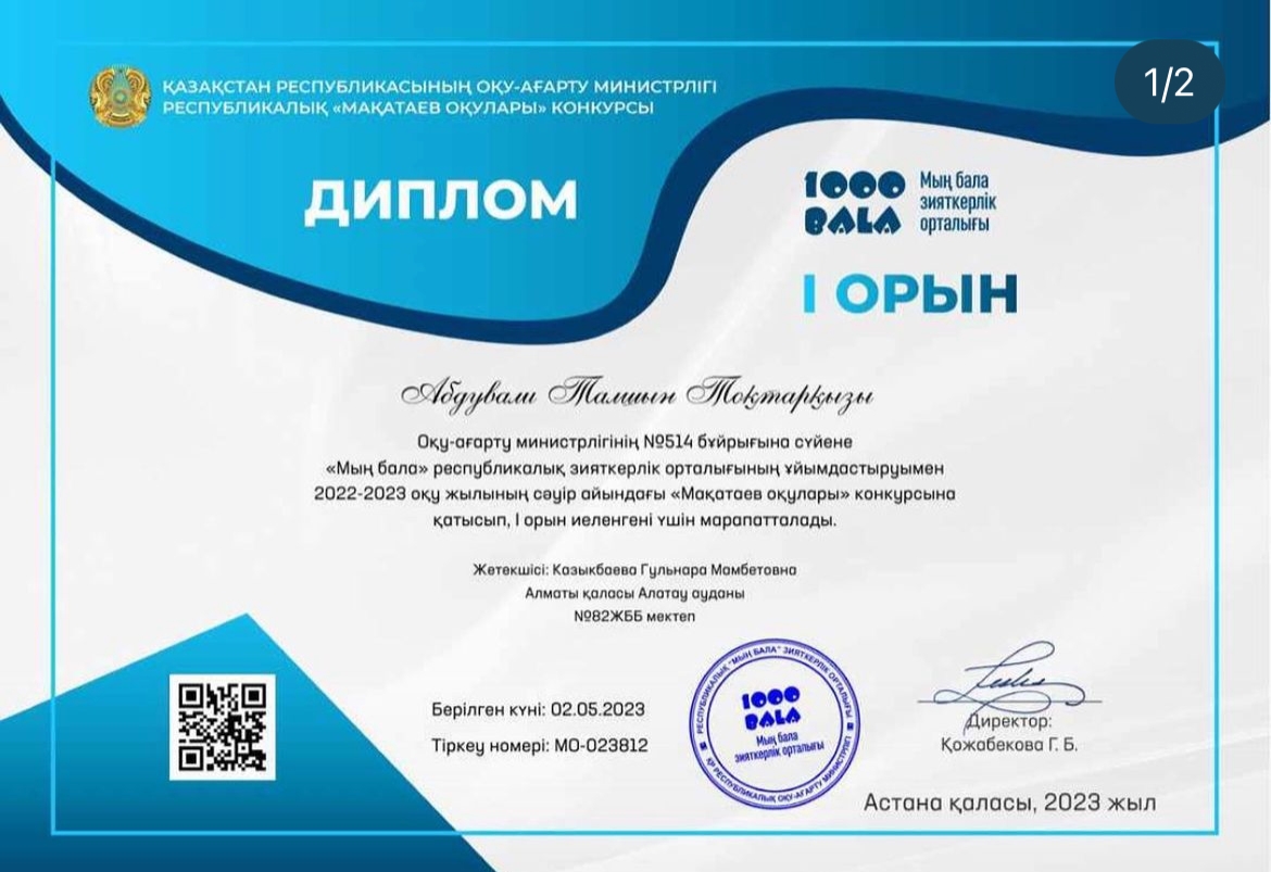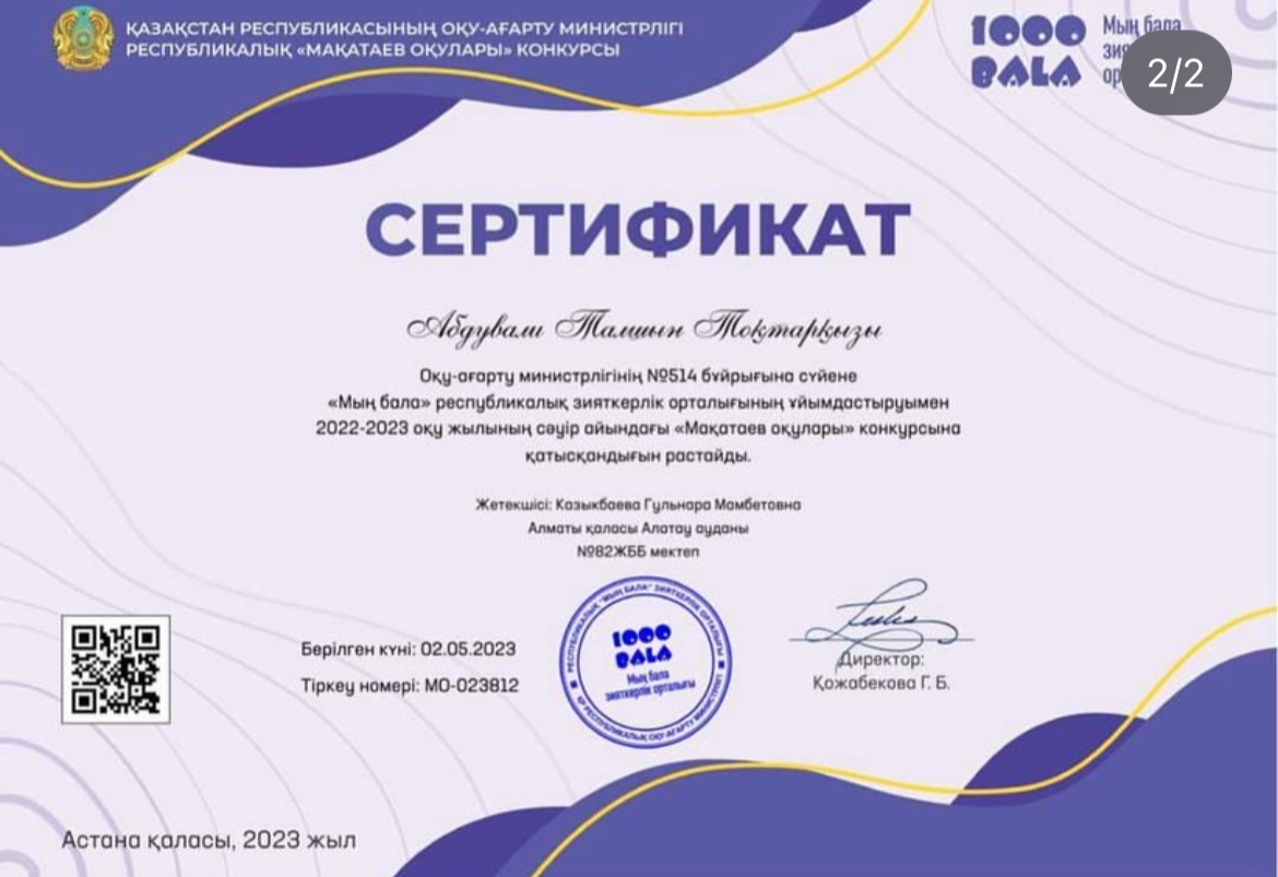 Оқу-ағарту министрлігінің №514 бұйрығына сүйене “Мың бала” республикалық зияткерлік орталығының ұйымдастыруымен 2022-2023 оқу жылының сәуір айындағы “Мақатаев оқулары” конкурсына қатысып, I орын иеленгені үшін 9 “А” сынып оқушысы Абдували Талшын Тоқтарқызы марапатталды.