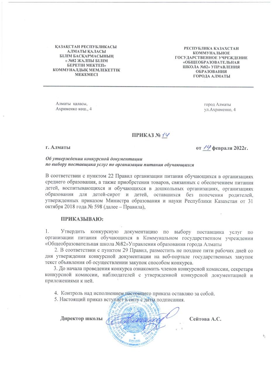 14 ақпан 2022 0 1 2 3 4 5 Об утверждении конкурсной документации по выбору поставщика услуг по организации питания обучающихся