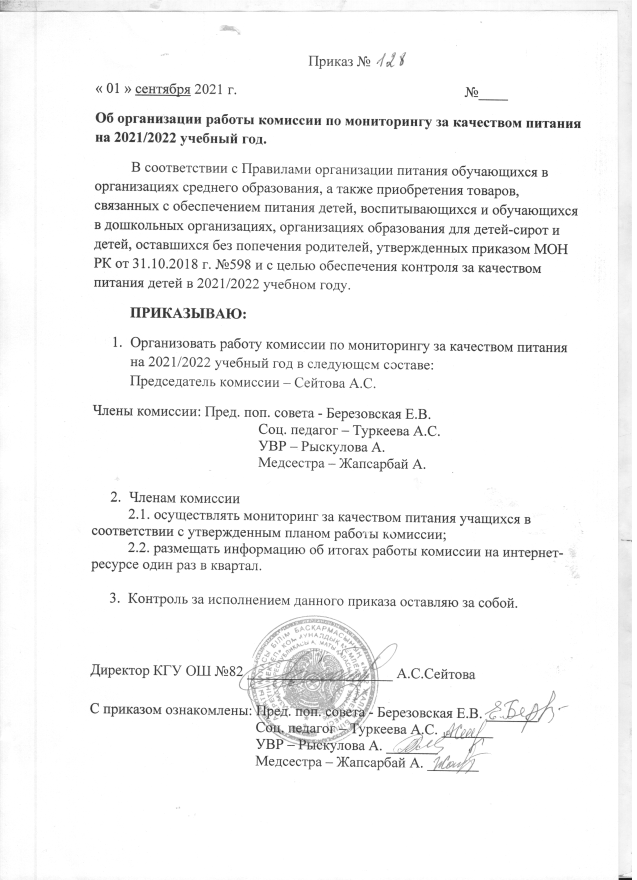 01 қыркүйек 2021 0 1 2 3 4 5 Об организации работы комиссии по мониторингу за качеством питания на 2021-2022 учебный год.