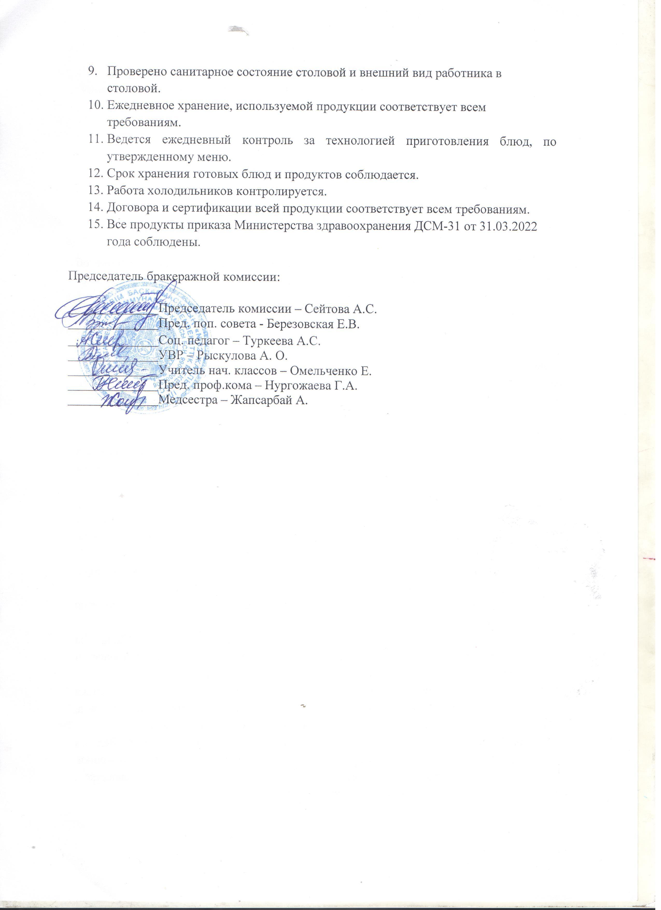 Акт проверки школьной столовой бракеражной комиссий от 27.04.2023